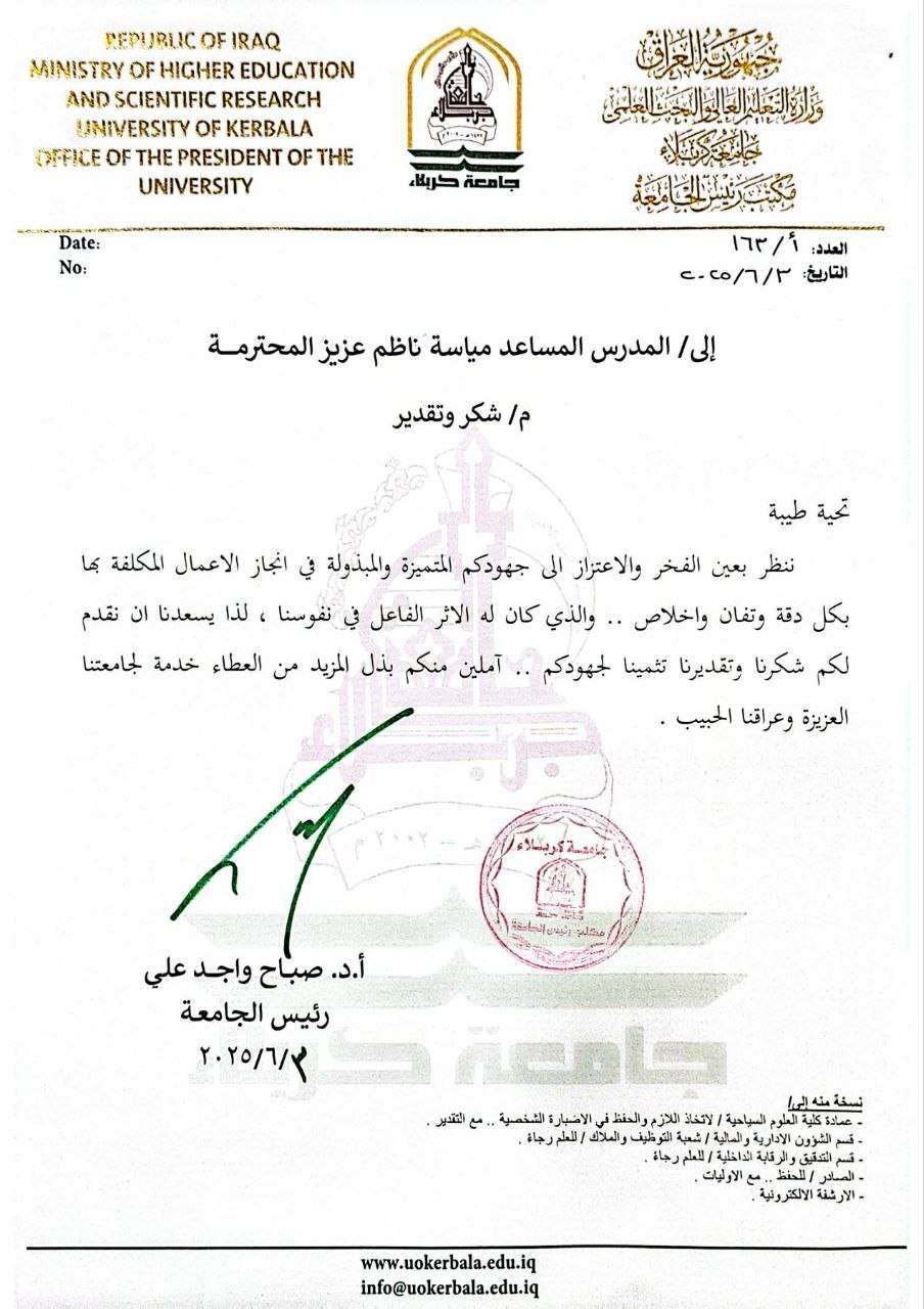 رئيسُ جامعةِ كربلاءَ يُكرِّمُ المُدرِّسَ المُساعدَ ميّاسةَ المَحَنَّه لتميُّزِها في أداءِ مهامِّها في وحدةِ التعليمِ المستمرِّ
