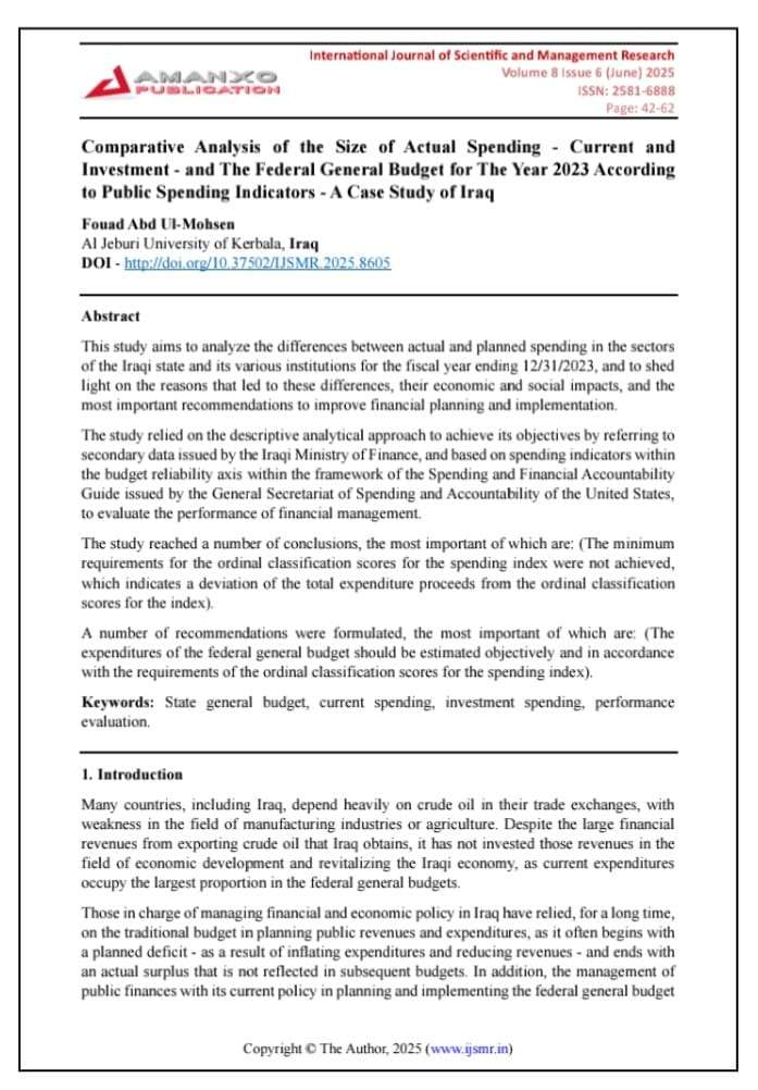 (تحليل مقارن لحجم الانفاق الفعلي والموازنة العامة الاتحادية لسنة 2023، في ظل مؤشرات الإنفاق العام)، إذ اعتمد الجبوري مؤشرات الانفاق العام ضمن محور موثوقية الموازنة في إطار دليل الانفاق والمساءلة المالية الصادر عن الأمانة العامة للإنفاق والمساءلة الأمريكية، لتقييم أداء الإدارة المالية في العراق. ويعد هذا إضافة علمية لجامعة كربلاء في المحافل الدولية.