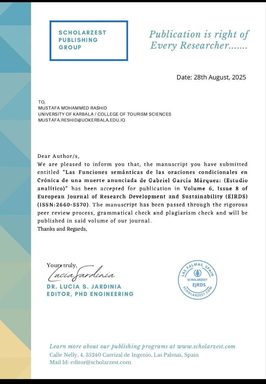 نشر التدريسي في كلية العلوم السياحية بجامعة كربلاء المدرس المساعد مصطفى محمد رشيد بحثا علميا في مجلة عالمية محكمة، وذلك ضمن تخصص اللغة الإسبانية واللسانيات.